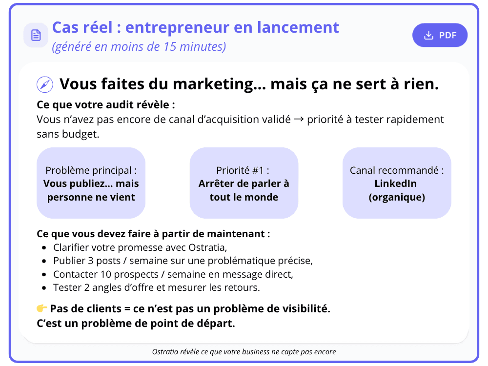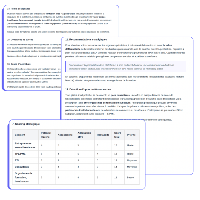 +150 analyses déjà réalisées, Résultats obtenus en 15 minutes, Utilisée par : freelances, dirigeants, PME, marketeurs...